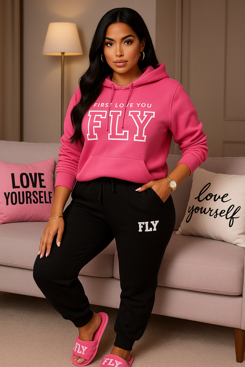 Oversized Hoodie: Designed with a relaxed fit and kangaroo pocket, finished with bold collegiate FLY lettering across the chest to remind you: First Love You.