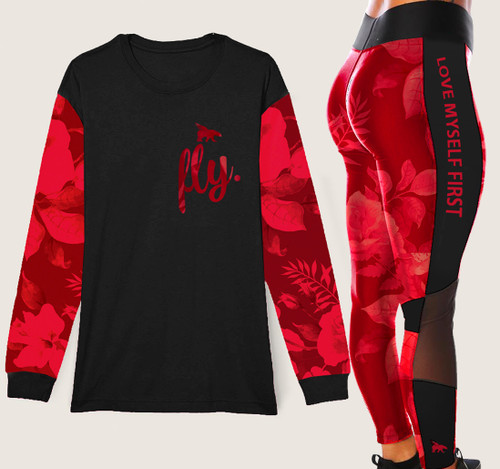 The deep red floral pattern flows seamlessly from the high-waist leggings to the long-sleeve crew, creating a head-to-toe statement that’s as fierce as it is flattering. The leggings sculpt and move with your body, while the fitted crew delivers that effortless, pulled-together vibe.